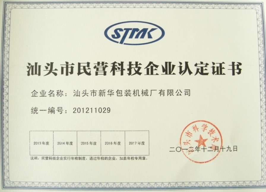 2012年12月19日,汕頭市新華包裝機械廠有限公司被汕頭市科學技術(shù)局認定為“汕頭市民營科技企業(yè)”。